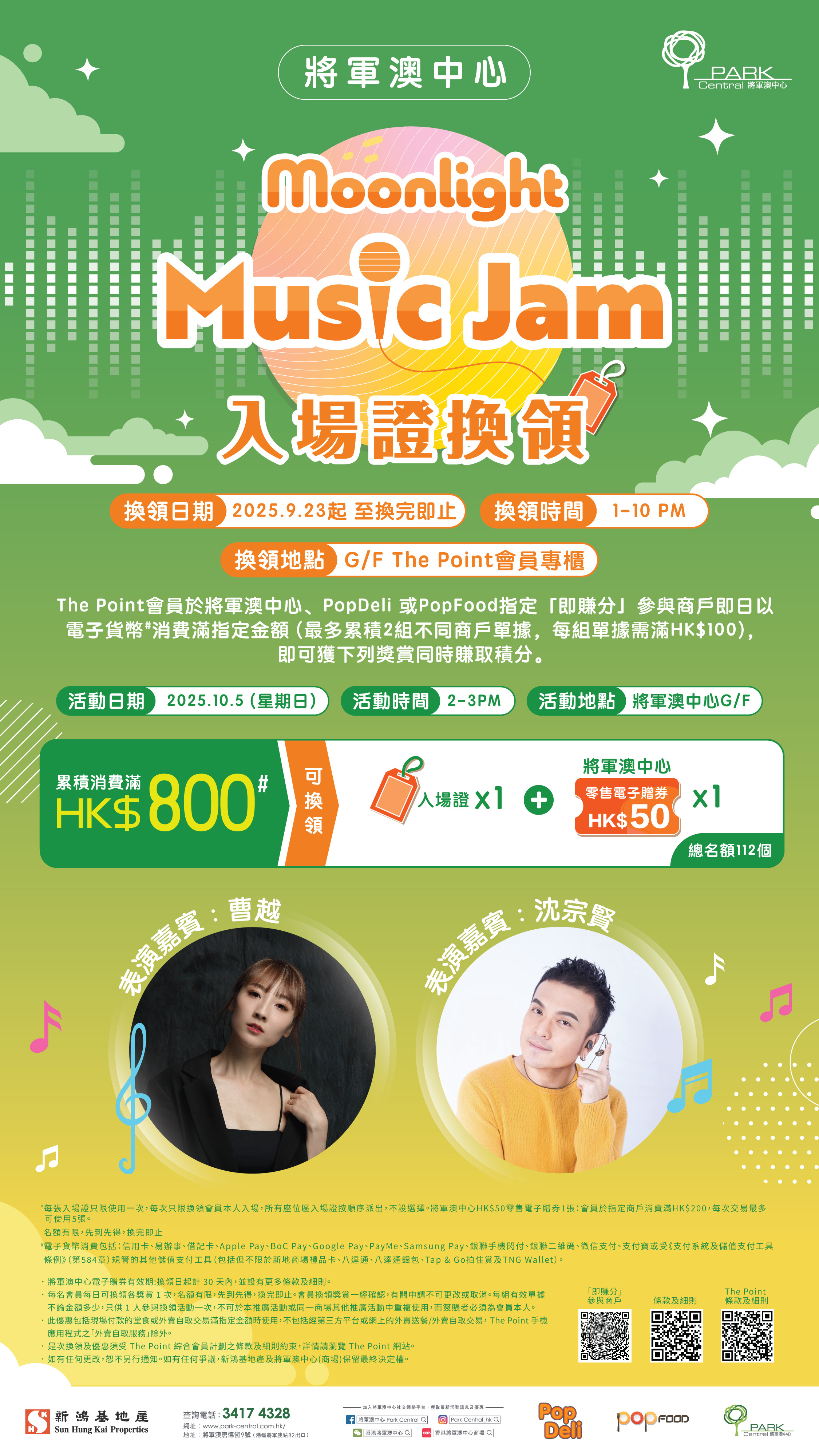 【Moonlight Music Jam】入場證一張 及 將軍澳中心HK$50零售電子禮券一張 (名額:112個)