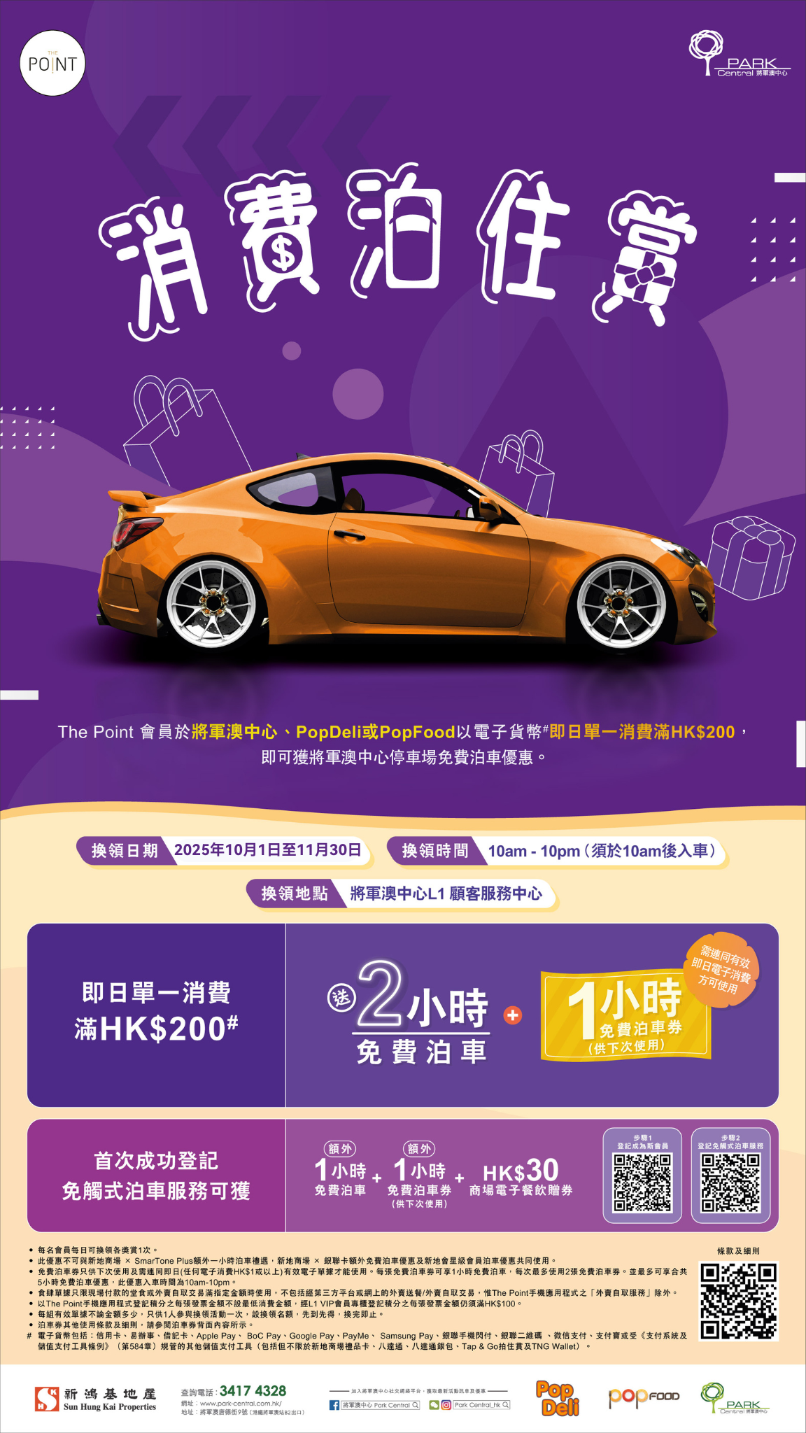 所有於PopFood及PopDeli的有效電子消費,只限換領將軍澳中心商場的免費泊車優惠及只限停泊於將軍澳中心商場時租停車場(不適用停泊於PopCorn/PopDeli/PopFood時租停車場)